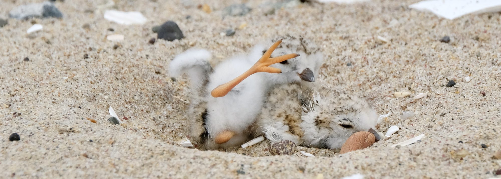 One of the many gifts we receive as Plover Ambassadors is watching tiny baby birds the size marshmallows develop into beautiful little flyers. The clips are of Fierce Dad and FairFeathered Mom’s offspring; the first clip is of two-day-old hatchlings, the second clip is of two-week-old chicks, and the last clips of the three- and a half-week-old chick. When Plovers hatch they can feed themselves entirely independent of the parent however, they need to thermoregulate to keep warm (otherwise known as thermo-snuggles and smooshies). The birds instinctively know to tuck under Mom and Dad’s wing to keep warm.