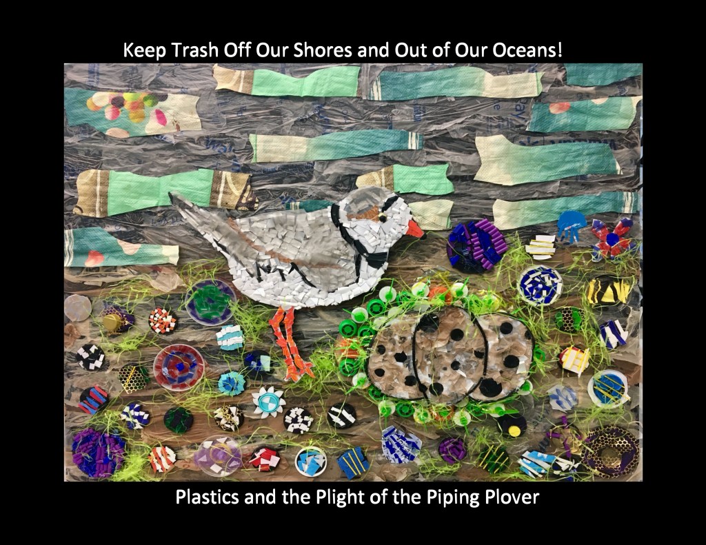 Students learned about the piping plover and the impact of plastics on shore and marine life. Students drew the bird, nest and eggs. They used plastics that were to be trashed and repurposed them to create this collage. Every student then made a shell to add to the creation.”