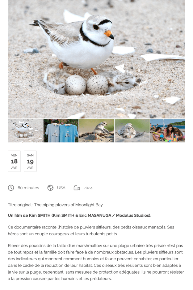 I have excellent news to share. The Piping Plovers of Moonlight Bay has been accepted to the Festival de l’Oiseau et de la Nature! It is the largest nature festival in France and takes place over a nine day period at the Bay of Somme. Located in the North of France, the Bay of Somme is an internationally recognized migratory site. For the past 33 years, in celebration of spring migration, the Festival has offered documentary screenings, activities for children, lectures, courses, and photo and art exhibits. This is a festival we were really, really hoping to be accepted to and I am over the Moon. We also recently received Best in Festival at the Nature Without Borders Film Festival and Outstanding Excellence at their sister festival, Documentaries Without Borders. It’s been a very exciting last couple of weeks.